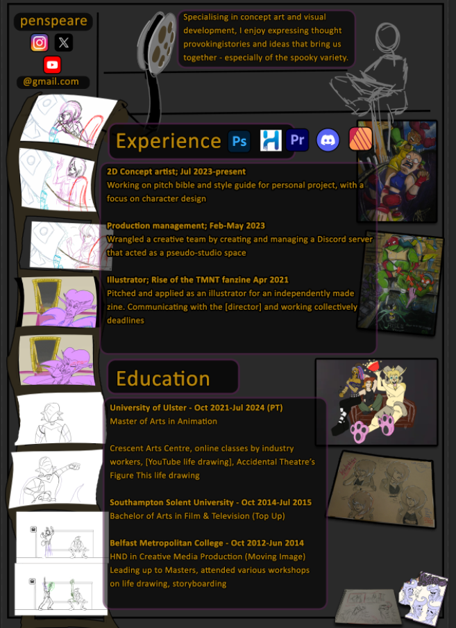 I was discussing with my mentor, Sarah, about the animator and artist CVs that I was researching, and how I noticed that a lot of them didn't have an introduction of sorts on their actual CV, but did on their Twitter or whatever social media platform they were posting it on. It all ties in together, and is a form of marketing yourself, as well as with sharing your work, your website and/or portfolio, and any showreel or individual videos either from YouTube or in GIF form.